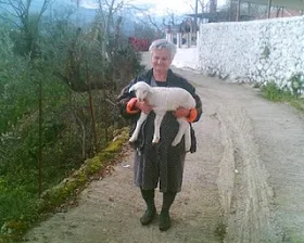 | Η κυρά Βασίλω Χαϊδάκη με περίσσια φροντίδα και στοργή κρατάει στην αγκαλιά της το μικρό αρνάκι |