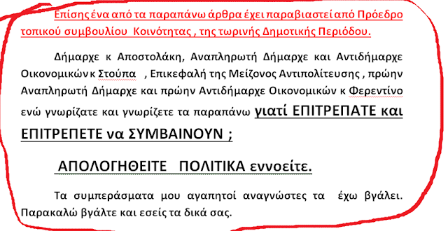 Δήμαρχε κ. Αποστολάκη, Αναπληρωτή Δήμαρχε και Αντιδήμαρχε Οικονομικών κ. Στούπα, Επικεφαλή της Μείζονος Αντιπολίτευσης, πρώην Αναπληρωτή Δήμαρχε και πρώην Αντιδήμαρχε Οικονομικών κ Φερεντίνο ενώ γνωρίζατε και γνωρίζετε τα παραπάνω γιατί ΕΠΙΤΡΕΠΑΤΕ και ΕΠΙΤΡΕΠΕΤΕ να ΣΥΜΒΑΙΝΟΥΝ;