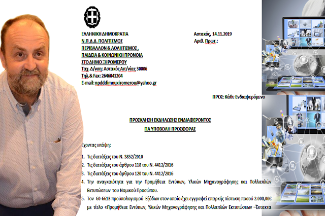 Παρακαλούμε τους ενδιαφερόμενους οικονομικούς φορείς, όπως εκδηλώσετε ενδιαφέρον με σχετική έγγραφη οικονομική προσφορά για την ανωτέρω προμήθεια έως την Τετάρτη 20.11.2019 στη Δ/νση: Αστακός Αιτ/νίας Τ.Κ. 30006, Φαξ.:2646041204, Email: npdddimouxiromerou@yahoo.gr .
