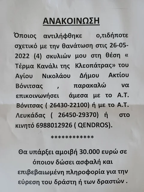 Ο ιδιοκτήτης τα είχε στο κτήμα του και φανερά σοκαρισμένος έχει κάνει την παρακάτω ενημέρωση προκειμένου να του δοθούν πληροφορίες ώστε να βρεθεί ο δράστης ή οι δράστες και να οδηγηθούν στη δικαιοσύνη.