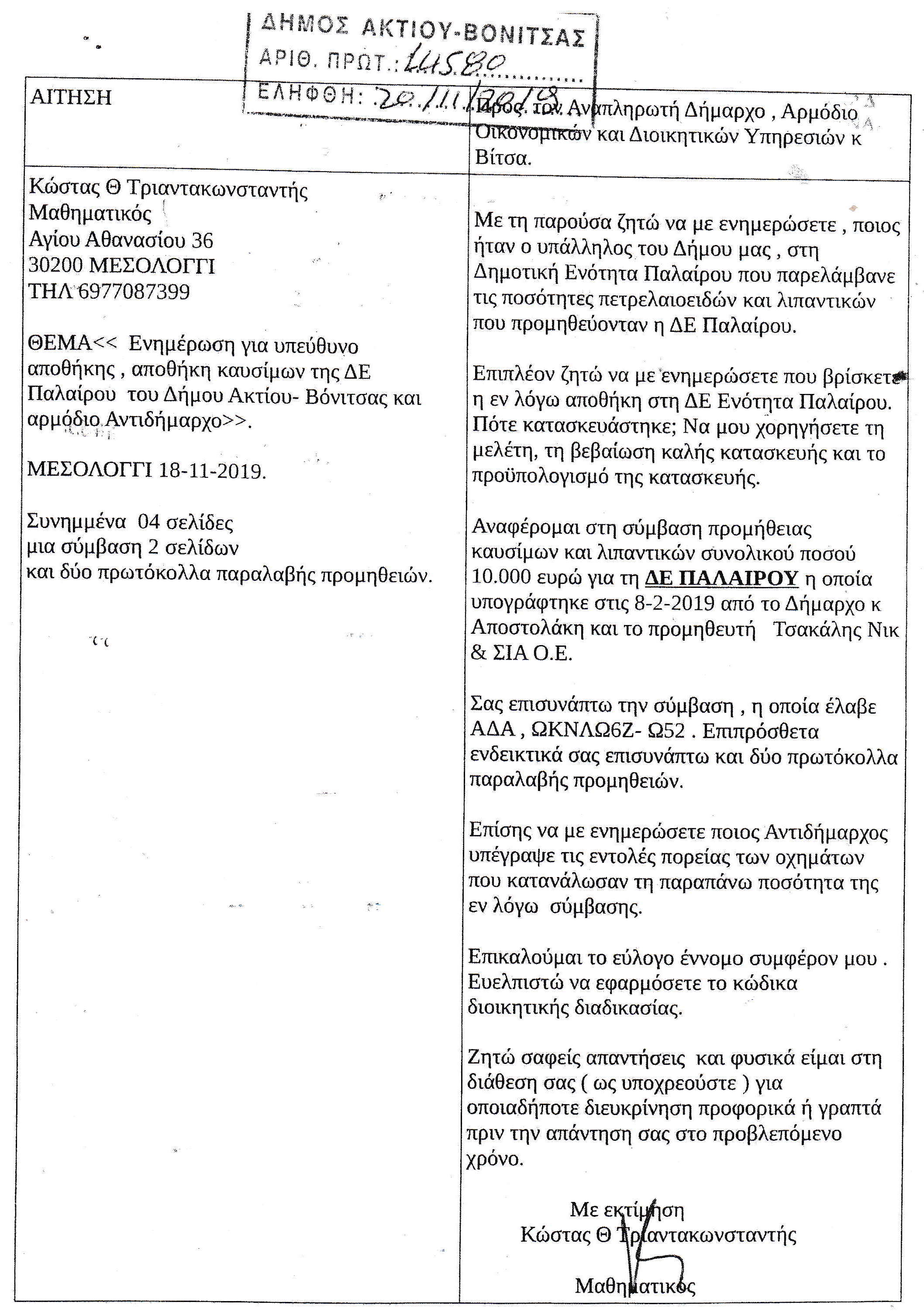 Έχω στο αρχείο μου, ανάμεσα σε πάρα πολλά άλλα , δύο επίσημα έγγραφα του Δήμου. Στα έγγραφα αυτά ο Δήμαρχος κ Αποστολάκης Γεώργιος- Θεόδωρος βεβαιώνει ότι τρεις οδηγοί του Δήμου το 2019 με τα ονόματα τους , προ των Δημοτικών εκλογών του 2019, ( οι οποίοι ήταν μέλη της επιτροπής καυσίμων) παρέλαβαν από προμηθευτή καυσίμων της ΔΕ Παλαίρου καύσιμα , τα οποία παρέδωσαν στον αρμόδιο της αποθήκης καυσίμων του Δήμου. Η σύμβαση έγινε μεταξύ Δήμου και προμηθευτή καυσίμων του Δήμου από τη ΔΕ Παλαίρου ΓΙΑ ΤΗ ΔΕ ΠΑΛΑΙΡΟΥ.