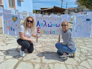 Έπειτα στο προαύλιο του νηπιαγωγείου μας απλώσαμε σε σχοινιά «τη μπουγάδα της ΕΥΤΥΧΙΑΣ», Στόχος μας είναι να συνδράμουμε στο να ανάψει μέσα σε όσους/ες δουν τα μπλουζάκια μας το φως που θα τους/τις βοηθήσει να διακρίνουν ότι η ευτυχία είναι στα απλά και καθημερινά της ζωής. Σε αυτά που βρίσκονται γύρω μας – κοντά μας. Εμείς είμαστε περήφανοι που καταφέραμε να βάλουμε ένα κρίκο στην «αλυσίδα της ευτυχίας » και καταφέραμε να δυναμώσουμε τη φλόγα της αγάπης στις καρδιές των μαθητών μας.