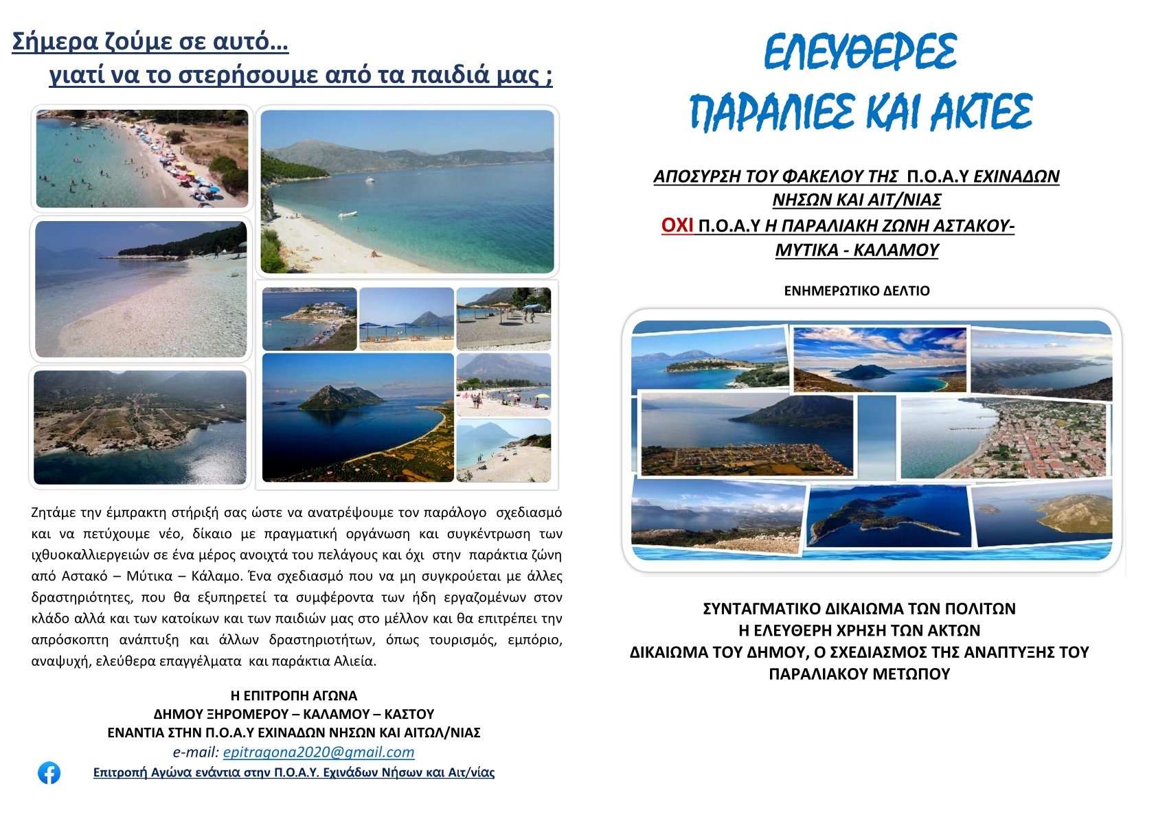 Με δεδομένη την στοχευμένη, και απαξιωτική για την κοινωνία συμπεριφορά του κόμματος της Ν.Δ, και σε κεντρικό επίπεδο, σε ότι αφορά την υπογραφή του Προεδρικού Διατάγματος για την ίδρυση της Π.Ο.Α.Υ Εχινάδων Νήσων και Αιτωλ/νίας.....